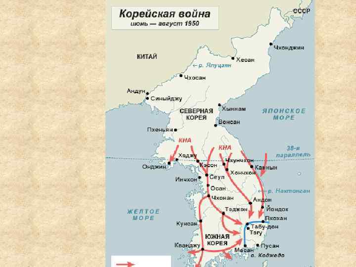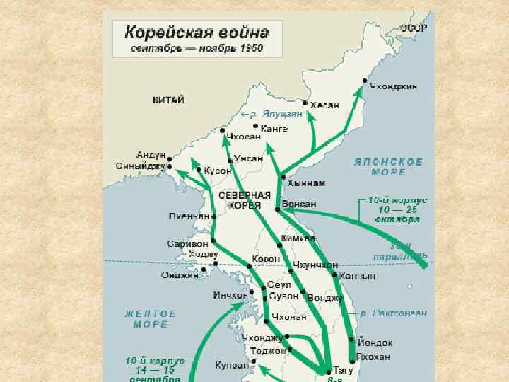 • В сентябре 1950 года, высадившаяся на небольшом плацдарме в районе г. Пусан американская армия разгромила армию КНДР • Развивая успех американская армия приблизилась к границам КНР