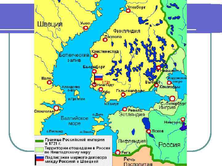 Окончание Северной войны Молодой русский флот под командованием Апраксина одержал грандиозные победы на море: в 1714 г. у мыса Гангут и в 1720 г. у острова Гренгам. l Швеция запросила мира, который был заключен в 1721 г. в городе Ништадте (Финляндия). По нему Россия включила в свой состав прибалтийские владения Швеции – Эстляндию (Эстонию), Лифляндию (Латвию) и Ингерманландию (часть Прибалтики, примыкающая к Санкт. Петербургу) l