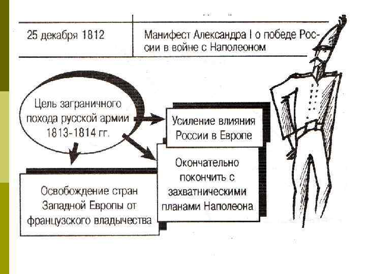 С изгнанием армии Наполеона из России война не окончилась. Кутузов выступал против продолжения войны, а Александр- за. -Подумайте, какие аргументы в пользу своей точке зрения могли выдвигать полководец и император? КУТУЗОВ Нет смысла в том, чтобы кровью русских солдат освобождать Европу. Русская армия понесла большие потери в Отечественной войне, она истощена. Поэтому в новой войне она столкнётся с огромными трудностями. АЛЕКСАНДР I Если дать Наполеону передышку, то Европа попрежнему останется в его власти и сохранится угроза русской армии на Немане. При продолжении войны можно рассчитывать на поддержку Пруссии.