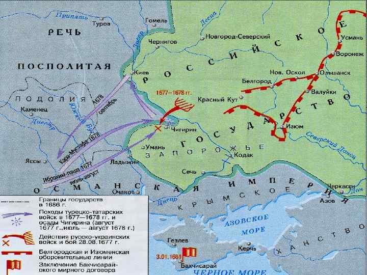 3. Русско-турецкая война. Чигиринские походы Летом 1678 г. султан направил к Чигирину 200 -тысячную армию. Ей противостояло 120 -тысячное русско-украинское войско После ожесточенных уличных боев гарнизон организованно оставил город. Но сражение главных сил русских и украинцев с турками заставило врага отступить В 1681 г. Россия заключила с Крымом Бахчисарайский договор. Султан ратифицировал его. Согласно условиям трактата, устанавливалось перемирие на 20 лет; Турция и Крым признали переход к России Левобережной Украины и Киева. Южная Киевщина, Брацлавщина, Подолия остались под властью султана и гетмана Юрия Хмельницкого Австрия и Польша наконец поняли опасность турецкой угрозы. Они заключают оборонительный антитурецкий союз. В 1683 г. польский король Ян Собеский под Веной разгромил большую турецкую армию. После этой победы Речь Посполитая возвращает себе Правобережную Украину 2/8/2018