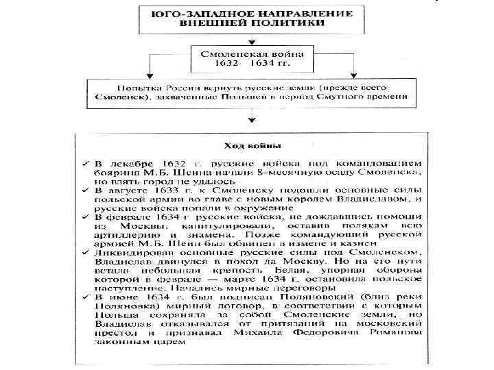 1. Русско-польская (Смоленская) война Но они не принесли удачи. В конце августа 1633 г. к Смоленску пришел Владислав с 15 -тысячным войском Часть своих сил ему удалось провести в осажденный город, и на этот раз в окружении оказалось войско Шеина. Русский командующий тщетно ждал подкреплений Склады в Дорогобуже разгромил польский отряд. В начале 1634 г. король предложил начать переговоры, и Шеин вынужден был согласиться Вскоре заключили перемирие: по его условиям Шеин вывел из окружения остатки своей армии, всего 8 тысяч человек, артиллерию и запасы оставил королю Король заключил мирный договор с Россией в Поляновке (июнь 1634 г. ). Он отказался от претензий на русский престол. Но Польше возвращались все города и земли, захваченные в ходе войны русскими. Смоленская война окончилась неудачно. Россия еще была слаба, чтобы вернуть утерянные земли. 2/8/2018