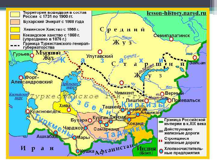 Зависимость от России признали: 1866 -1868 гг. Бухарский эмират 1873 г. – Хивинское ханство Вошло в состав России: 1864 -1876 г. – Кокандское ханство