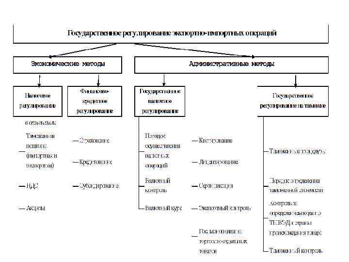 Государственное регулирование внешней торговли на международном уровне двухсторонних и многосторонних договоров по регулированию внешней торговли; системы информационного мониторинга мировой сферы внешней торговли; системы правовых основ межгосударственного регулирования внешней торговли; на государственном уровне системы мер тарифного и нетарифного регулирования внешней торговли; системы информационного мониторинга внешней торговли; правовых основ регулирования внешней торговли; системы таможенных режимов; на корпоративном уровне системы информационного мониторинга внешней торговли, включая средства оперативного мониторинга, их анализ и прогноз; системы правил и норм управления внешней торговлей; комплекса методического обеспечения для обоснования рациональных методов управления внешней торговлей.
