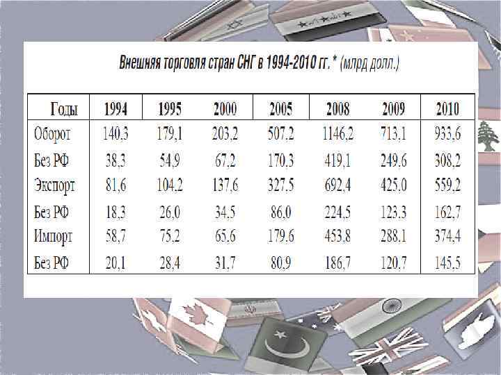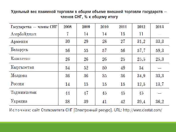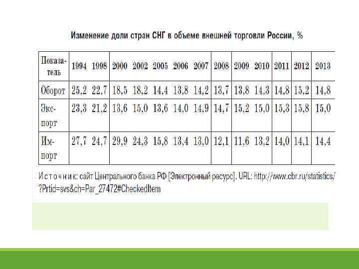 Об итогах взаимной торговли РФ и СНГ в 2014 г. o. В общем объеме внешнеторгового оборота России на долю государств – участников СНГ а 2014 году приходилось 12, 2% (в 2013 году – 13, 4%). o. Товарооборот России с государствами – участниками СНГ в 2014 году составил 95, 6 млрд. долларов США, в том числе экспорт – 63, 6 млрд. долларов США, импорт – 32 млрд. долларов США. o. По сравнению с 2013 годом товарооборот сократился на 15%, в том числе экспорт – на 14%, импорт –а 17%. o. Сальдо торгового баланса со странами СНГ сложилось положительное в размере 31, 6 млрд. долларов США (в 2013 году – 35, 3 млрд. долларов США).
