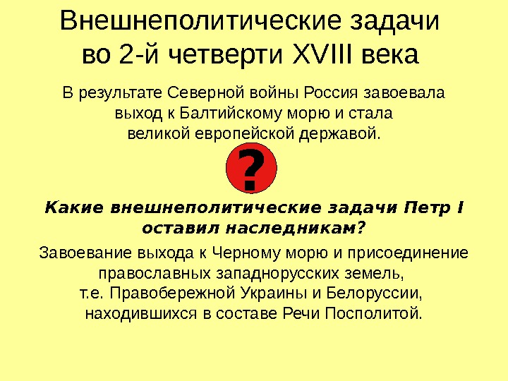 Внешнеполитические задачи во 2 -й четверти XVIII века В результате Северной войны Россия завоевала выход к Балтийскому морю и стала великой европейской державой. Какие внешнеполитические задачи Петр I оставил наследникам? Завоевание выхода к Черному морю и присоединение православных западнорусских земель, т. е. Правобережной Украины и Белоруссии, находившихся в составе Речи Посполитой. ?