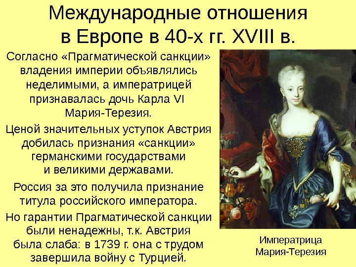 Международные отношения в Европе в 40 -х гг. XVIII в. Согласно «Прагматической санкции» владения империи объявлялись неделимыми, а императрицей признавалась дочь Карла VI Мария-Терезия. Ценой значительных уступок Австрия добилась признания «санкции» германскими государствами и великими державами. Россия за это получила признание титула российского императора. Но гарантии Прагматической санкции были ненадежны, т. к. Австрия была слаба: в 1739 г. она с трудом завершила войну с Турцией. Императрица Мария-Терезия
