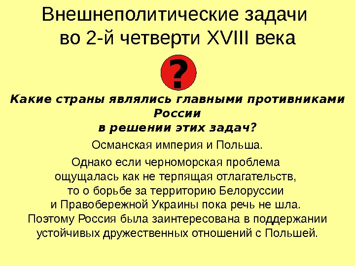 Внешнеполитические задачи во 2 -й четверти XVIII века Какие страны являлись главными противниками России в решении этих задач? Османская империя и Польша. Однако если черноморская проблема ощущалась как не терпящая отлагательств, то о борьбе за территорию Белоруссии и Правобережной Украины пока речь не шла. Поэтому Россия была заинтересована в поддержании устойчивых дружественных отношений с Польшей. ?