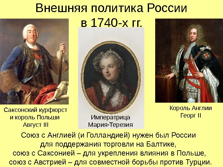 Внешняя политика России в 1740 -х гг. Король Англии Георг II Союз с Англией (и Голландией) нужен был России для поддержания торговли на Балтике, союз с Саксонией – для укрепления влияния в Польше, союз с Австрией – для совместной борьбы против Турции. Саксонский курфюрст и король Польши Август III Императрица Мария-Терезия