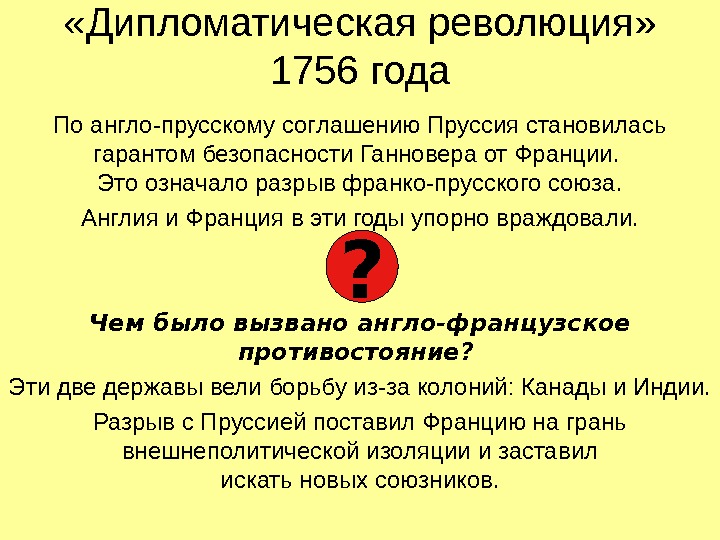 «Дипломатическая революция» 1756 года По англо-прусскому соглашению Пруссия становилась гарантом безопасности Ганновера от Франции. Это означало разрыв франко-прусского союза. Англия и Франция в эти годы упорно враждовали. Чем было вызвано англо-французское противостояние? Эти две державы вели борьбу из-за колоний: Канады и Индии. Разрыв с Пруссией поставил Францию на грань внешнеполитической изоляции и заставил искать новых союзников. ?
