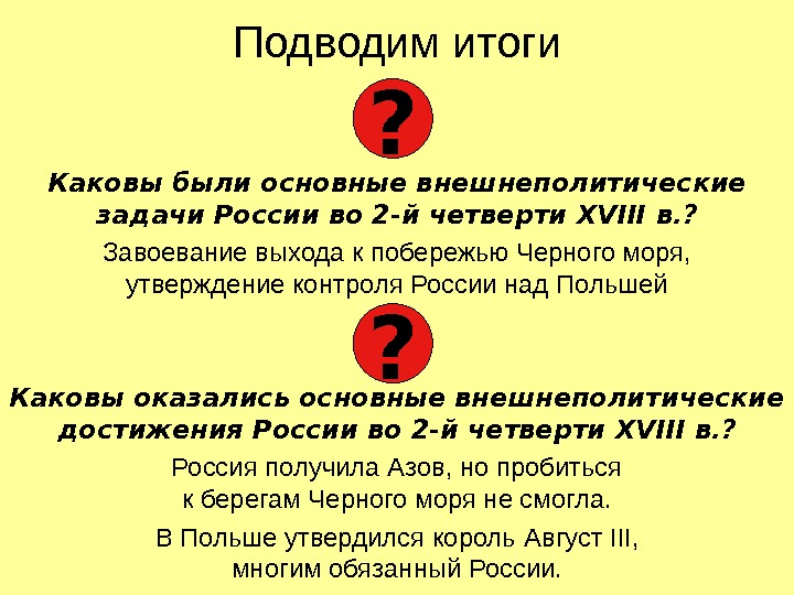 Подводим итоги Каковы были основные внешнеполитические задачи России во 2 -й четверти XVIII в. ? Завоевание выхода к побережью Черного моря, утверждение контроля России над Польшей Каковы оказались основные внешнеполитические достижения России во 2 -й четверти XVIII в. ? Россия получила Азов, но пробиться к берегам Черного моря не смогла. В Польше утвердился король Август III , многим обязанный России. ? ?