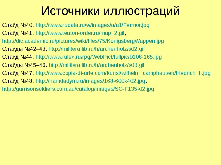 Источники иллюстраций Слайд № 40. http: //www. rudata. ru/w/images/a/a 1/Fermor. jpg Слайд № 41. http: // www. teuton-order. ru /map_2. gif , http: //dic. academic. ru/pictures/wiki/files/75/Konigsberg. Wappen. jpg Слайды № 42– 43. http: //militera. lib. ru/h/archenholz/s 02. gif Слайд № 44. http: //www. rulex. ru/rpg/Web. Pict/fullpic/0108 -165. jpg Слайды № 45– 46. http: //militera. lib. ru/h/archenholz/s 03. gif Слайд № 47. http: //www. copia-di-arte. com/kunst/wilhelm_camphausen/friedrich_II. jpg Слайд № 48. http: //namdadym. ru/images/168 -600 x 402. jpg , http: //garisonsoldiers. com. au/catalog/images/SG-F 135 -02. jpg