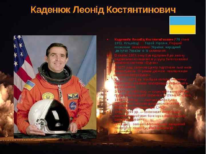 Після Корольова Валентин Глушко. Людина № 2 після Корольова у космонавтиці радянської доби, одесит, завжди підкреслював в анкетах – «українець» , вчений-фізик, конструктор. Двигуни, створені КБ Валентина Глушка, підняли у космос перший штучний супутник Землі, першу автоматичну наукову станцію, що сягнула Місяця, першу пілотовану орбітальну станцію «Салют» , першу автоматичну станцію, що здійснила м‘яку посадку на поверхню Марса, зрештою, унікальний орбітальний літак «Буран» . Досі російська космонавтика використовує двигуни, створені КБ Глушка. Надпотужний носій «Енергія» , що виводив на навколоземну орбіту масу понад 100 тонн, був запущений 1987 року.