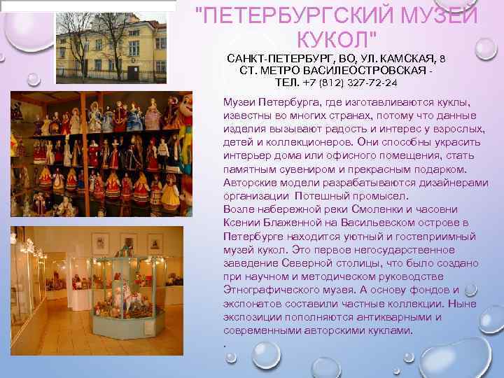 "ПЕТЕРБУРГСКИЙ МУЗЕЙ КУКОЛ" САНКТ-ПЕТЕРБУРГ, ВО, УЛ. КАМСКАЯ, 8 СТ. МЕТРО ВАСИЛЕОСТРОВСКАЯ ТЕЛ. +7 (812) 327 -72 -24 Музеи Петербурга, где изготавливаются куклы, известны во многих странах, потому что данные изделия вызывают радость и интерес у взрослых, детей и коллекционеров. Они способны украсить интерьер дома или офисного помещения, стать памятным сувениром и прекрасным подарком. Авторские модели разрабатываются дизайнерами организации Потешный промысел. Возле набережной реки Смоленки и часовни Ксении Блаженной на Васильевском острове в Петербурге находится уютный и гостеприимный музей кукол. Это первое негосударственное заведение Северной столицы, что было создано при научном и методическом руководстве Этнографического музея. А основу фондов и экспонатов составили частные коллекции. Ныне экспозиции пополняются антикварными и современными авторскими куклами. .