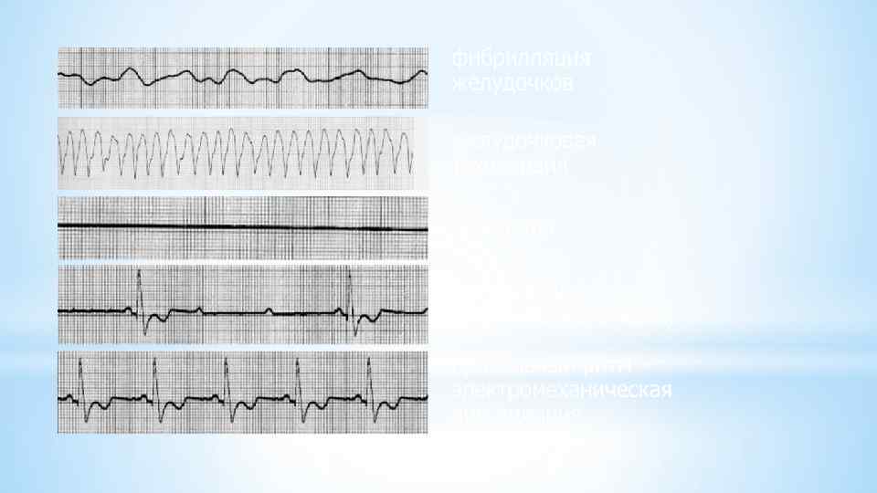 * Причины внезапной кардиальной смерти *Фибрилляция желудочков *Устойчивая желудочковая тахикардия *Выраженная брадикардия *Асистолия *Электромеханическая диссоциация