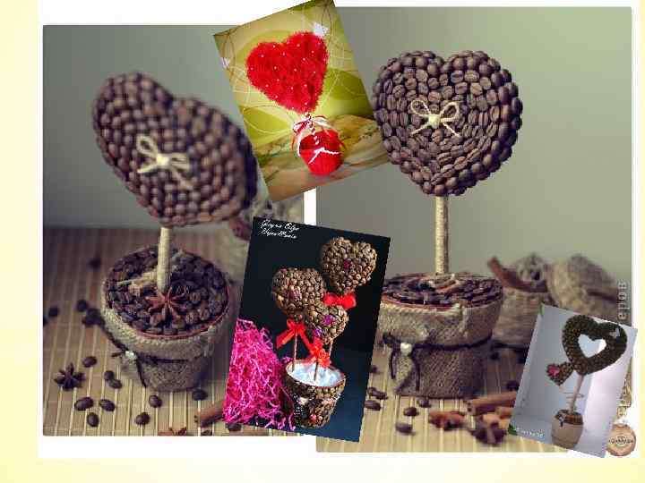 * Топиарии (деревья счастья) в форме сердца, композиции из искусственных цветов.