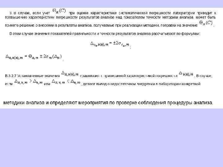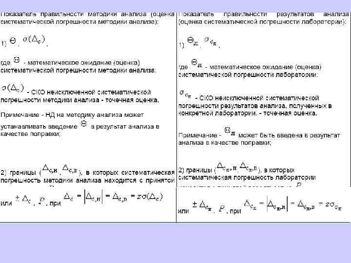 Показатель правильности методики анализа — приписанная характеристика систематической погрешности методики анализа , ( с) где — математическое ожидание (оценка) систематической погрешности методики анализа; ( с) — среднее квадратическое отклонение неисключенной систематической погрешности методики анализа — точечная оценка. может быть введена в результат единичного анализа в качестве поправки. Границы ( c. н, c. в), в которых систематическая погрешность методики анализа находится с принятой вероятностью Р — интервальная оценка, или ± с, Р, где c. в = | c. н| = с = Z с