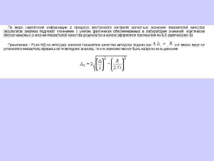 Допустимо (при сложности организации в лаборатории работ по оценке показателей качества результатов анализа при реализации методик с установленными показателями качества применительно к номенклатуре объектов анализа и контролируемых в них показателей) показатели качества результатов анализа при внедрении процедуры внутреннего контроля (на стадии 1 -го этапа) устанавливать расчетным способом на основе выражений (исходя из предположения симметричности и одномодальности распределения погрешности результатов анализа и при условии
