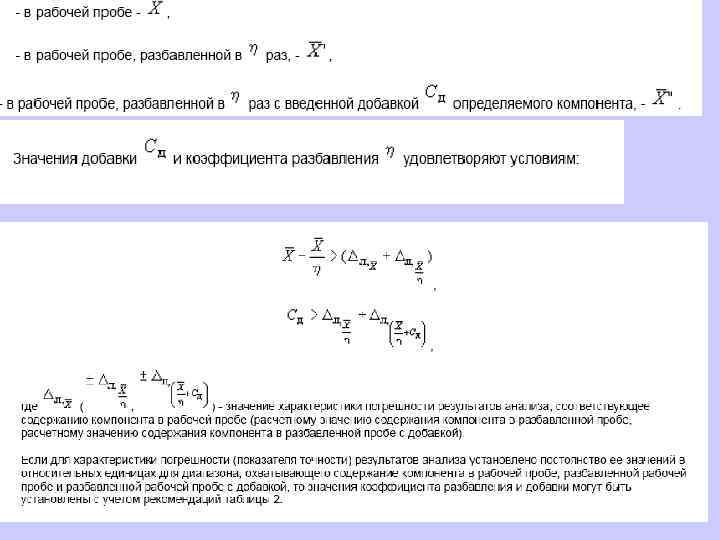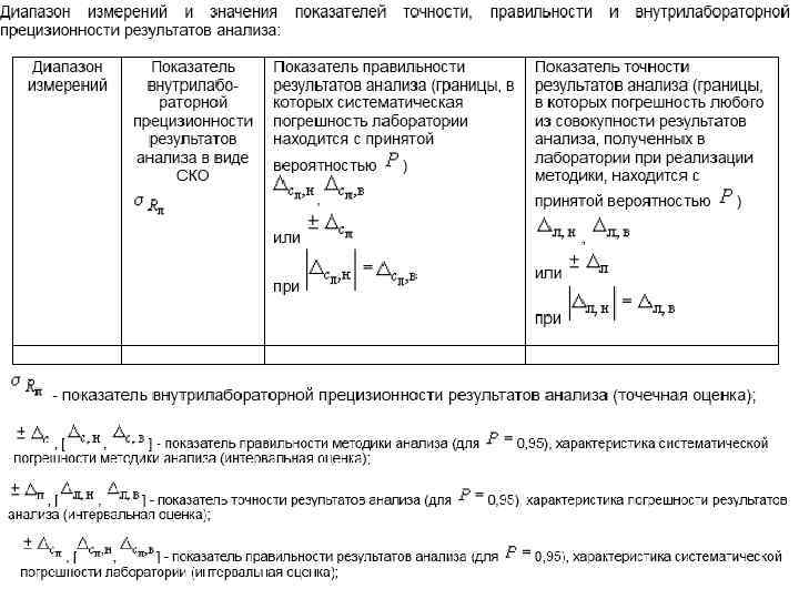 - характеристика погрешности результатов определений (полуширина интервала, в котором погрешность результатов определений находится с принятой вероятностью = 0, 95); ( ) - характеристика погрешности результатов определений (среднее квадратическое отклонение, характеризующее точность результатов определений); характеристика систематической составляющей погрешности (полуширина интервала, в котором систематическая составляющая погрешности результатов определений находится с принятой вероятностью = 0, 95); ( ) - характеристика систематической составляющей погрешности (среднее квадратическое отклонение, характеризующее правильность результатов определений); - ( ) - характеристика случайной составляющей погрешности (среднее квадратическое отклонение, характеризующее воспроизводимость результатов определений);