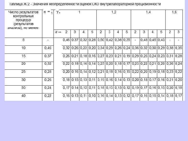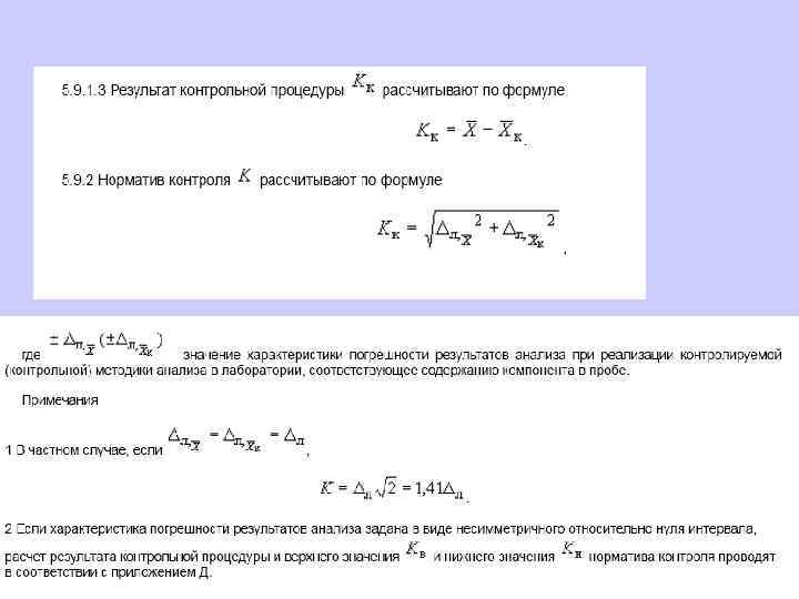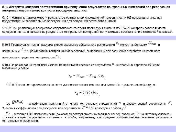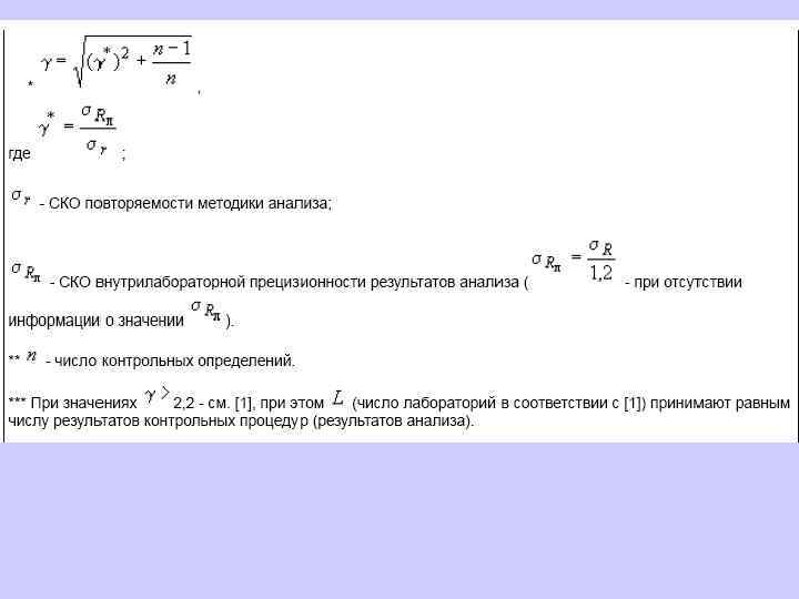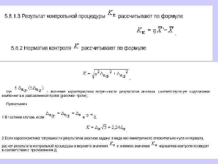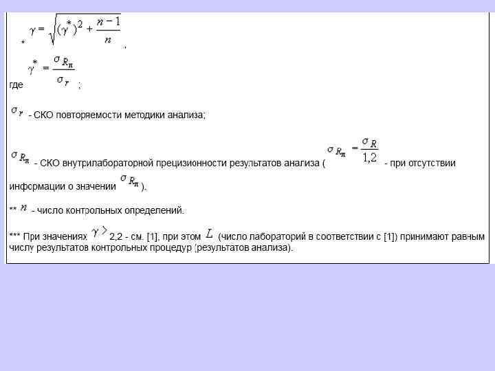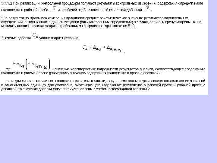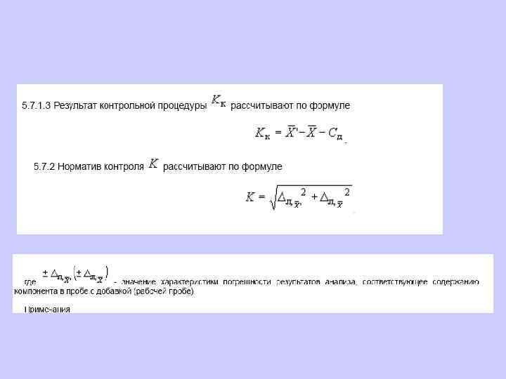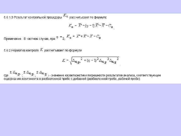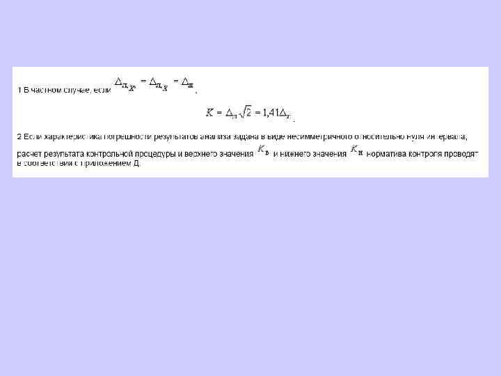 ( ) - характеристика составляющей случайной составляющей погрешности (среднее квадратическое отклонение, характеризующее сходимость результатов определений); - допускаемое значение (норма) погрешности; - норматив оперативного контроля сходимости (допускаемое расхождение результатов параллельных определений); - - норматив оперативного контроля воспроизводимости (допускаемое расхождение результатов анализа одной и той же пробы, полученных в условиях воспроизводимости); - коэффициент, устанавливающий связь между характеристикой случайной составляющей погрешности и составляющей случайной составляющей погрешности