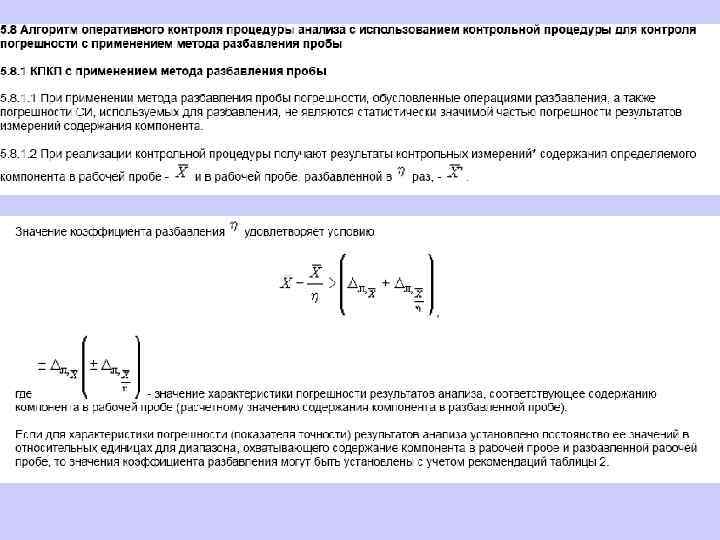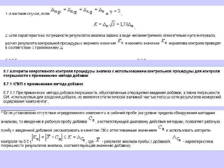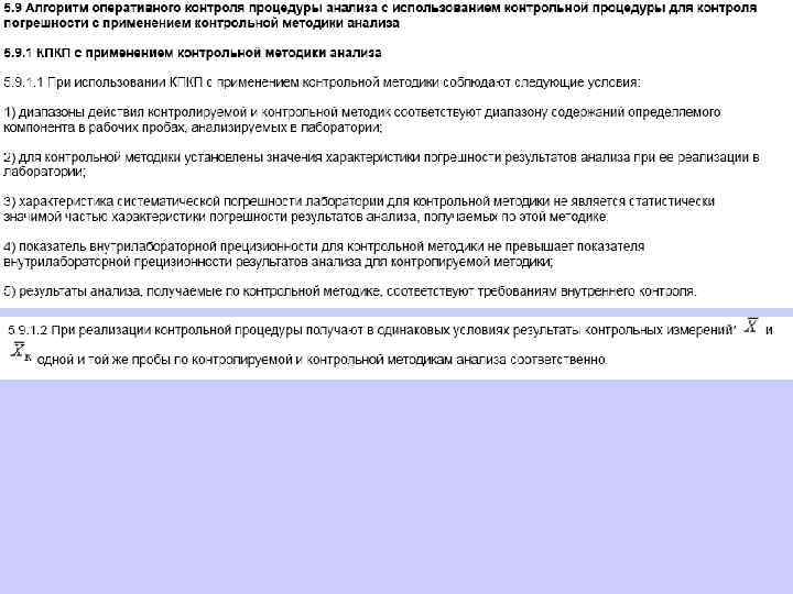 Алгоритм оперативного контроля процедуры анализа с использованием контрольной процедуры для контроля погрешности с применением образцов для контроля ОК должны быть адекватны анализируемым пробам (возможные различия в составах ОК и анализируемых проб не вносят в результаты анализа дополнительную статистически значимую погрешность). Погрешность аттестованного значения ОК - не более одной трети от характеристики погрешности результатов анализа.