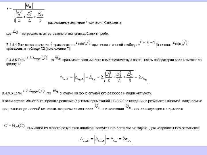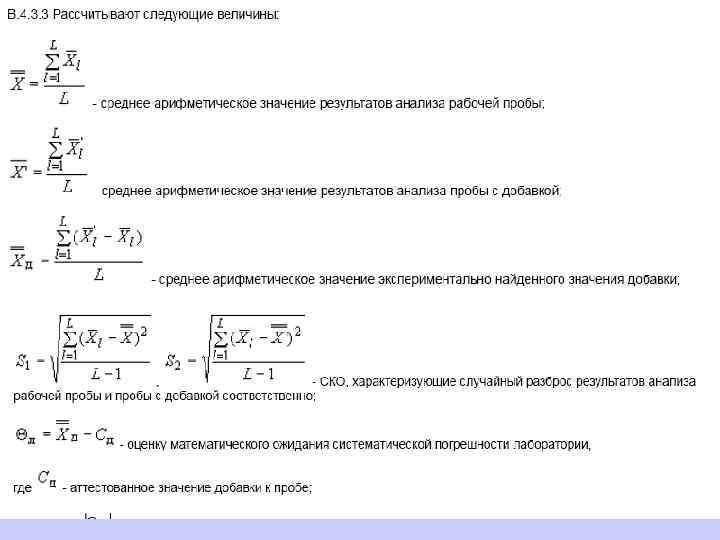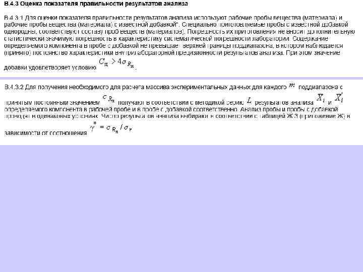 Рекомендуемые алгоритмы оценивания характеристик погрешности, внутрилабораторной прецизионности, систематической погрешности лаборатории - в соответствии с приложением В. В соответствии с требованиями НД на методику анализа получают L результатов анализа аттестованной характеристики в пробах ОО, используемых при проведении эксперимента. Число результатов анализа для каждого ОО устанавливают достаточным для обеспечения достоверной оценки характеристики систематической погрешности лаборатории. Оценку систематической погрешности лаборатории признают достоверной, если ее неопределенность не превышает 0, 33.