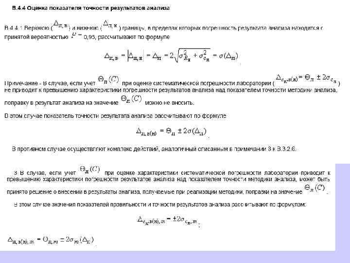 Показатель точности методики анализа — приписанная характеристика погрешности методики анализа Границы ( н, в), в которых погрешность любого из совокупности результатов анализа находится с принятой вероятностью Р — интервальная оценка, или , Р, при = | н| = в = Z ( ), где Z— квантиль распределения, зависящий от его типа и принятой вероятности Р. Среднее квадратическое отклонение — ( ) погрешности результатов анализа, полученных во всех лабораториях, применяющих данную методику анализа, — точечная оценка