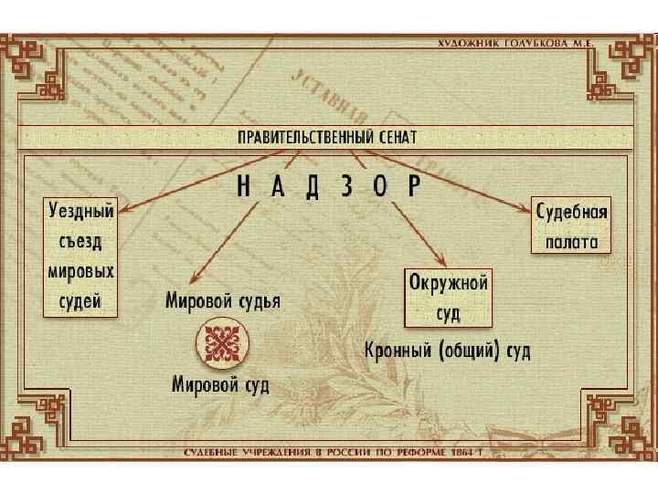 Наиболее последовательная и прогрессивная Судебная реформа 1864 г. : 1. 2. 3. 4. 5. 6. 7. 8. Равенство (формальная бессословность) граждан перед законом. Несменяемость судей и независимость их от администрации. Гласность судопроизводства. Состязательность судопроизводства (обвинение – защита); учреждена адвокатура (присяжные поверенные). Институт присяжных заседателей для рассмотрения сложных уголовных дел. Создана система быстрых и бесплатных мировых судов. Вводилась выборность мировых судей. Упрощена система судопроизводства и сокращено число судебных инстанций. Но! Сохранились сословные суды (для крестьян, духовенства, военных и высших чиновников).