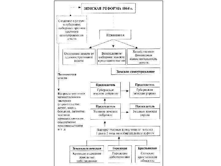 Основные положения земской реформы 1864 г. • Земскими учреждениями становились губернские и уездные земские собрания и их исполнительные органы. • Земства занимались местным хозяйством, здравоохранением, строительством дорог, образованием. • Земства не имели политической силы и находились под контролем губернаторов. • Избирательная система обеспечивала в них большинство дворян (выборы в земства были многоступенчатыми и неравными).