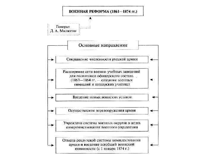 Военная реформа (1861 -1874 гг. ): • Сокращена численность армии. • Приняты новые воинские уставы. • Расширена сеть военно-учебных заведений (военные гимназии, юнкерские училища, военные академии). • Создана система военных округов. • Проведено перевооружение армии. • Отменена рекрутская система. Введена всеобщая воинская повинность (с 1 января 1874 г. ). Д. А. Милютин Все мужчины с 20 лет 6 лет службы в сухопутных войсках 7 лет службы на флоте