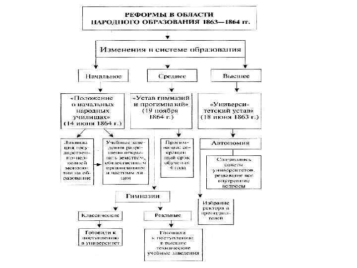 Реформы в области народного образования 1863 -1864 гг. Начальное образование Среднее образование «Положение о начальных народных училищах» 1864 г. «Положение гимназий и прогимназий» 1864 г. Учебные заведения могли открывать земства, общественные организации, частные лица + женские гимназии Прогимназии (4 года обучения) Гимназии Реальные Готовили к поступлению в высшие технические учебные заведения Высшее образование «Университетский устав» 1863 г. Автономия (выборность ректоров, проректоров, деканов, профессоров; создание советов университетов) Классические Готовили к поступлению в университет Образование стало более доступным для представителей различных сословий
