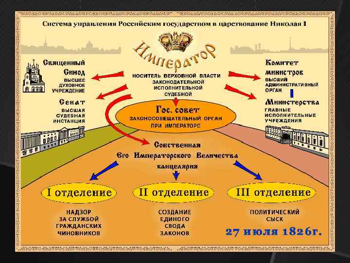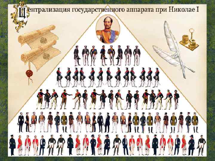Внутренняя политика Николая I 1825 -1855 Николай понимал власть царя, как власть хозяина. Россия – это собственность, а всякая собственность священна. Хозяин должен заботиться о своем добре, не расточать его, копить, выбирать хороших и верных слуг. Все должны безропотно исполнять его хозяйскую волю. В хозяйстве должна быть строгая иерархия. Все должно быть подчинено дисциплине, должен быть закон.