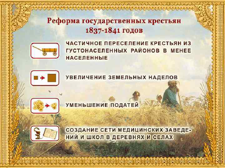 Реформа государственных крестьян графа П. Д. Киселева • малоземельные крестьяне наделялись землей из специального фонда (переселялись на новые земли); • была разработана система ссуд для мелкого крестьянского кредита; • расширена сеть запасных магазинов (складов) на случай неурожая; • началось строительство школ, больниц; • была пересмотрена система обложения податями.