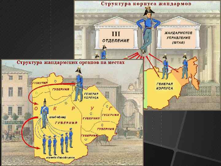 III отделение СЕИВК Полномочия IIIотделения СЕИВК • ведение дел высшей политической полиции; • осуществление высылки подозрительных лиц; • решение вопросов по сектам и расколу; • принятие постановлений об иностранцах и поднадзорных лицах; • заведование местами заключения; • ведение ведомостей о всех происшествиях; • обобщение статистических сведений полицейского характера; • контроль за театральной деятельностью в стране.