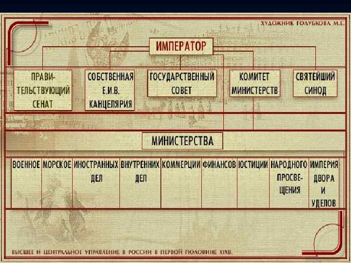 Собственная Его Императорского Величества Канцелярия I Отделение (Представляло царю поступающие на его имя бумаги и исполняло его личные поручения) II Отделение (Создано в 1826 г. Во главе М. М. Сперанский. Занималось кодификацией законов)