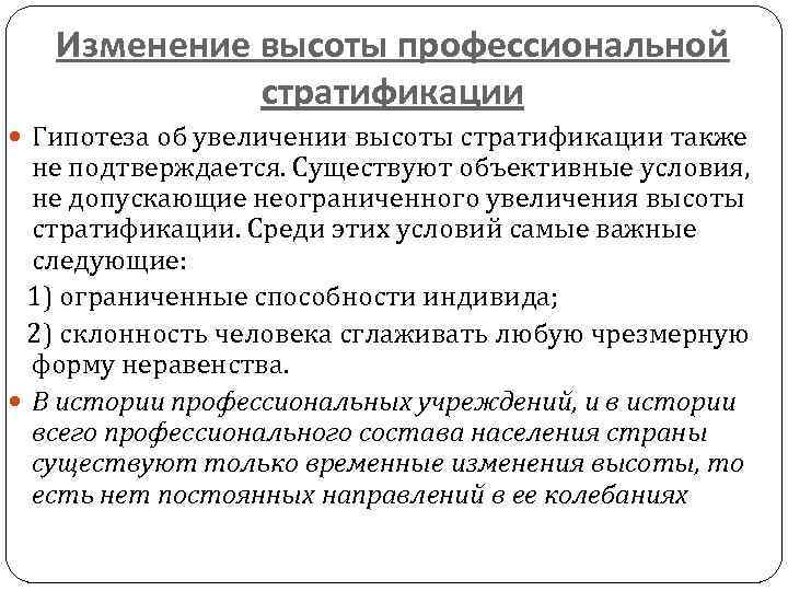 Изменение высоты профессиональной стратификации Гипотеза об увеличении высоты стратификации также не подтверждается. Существуют объективные условия, не допускающие неограниченного увеличения высоты стратификации. Среди этих условий самые важные следующие: 1) ограниченные способности индивида; 2) склонность человека сглаживать любую чрезмерную форму неравенства. В истории профессиональных учреждений, и в истории всего профессионального состава населения страны существуют только временные изменения высоты, то есть нет постоянных направлений в ее колебаниях