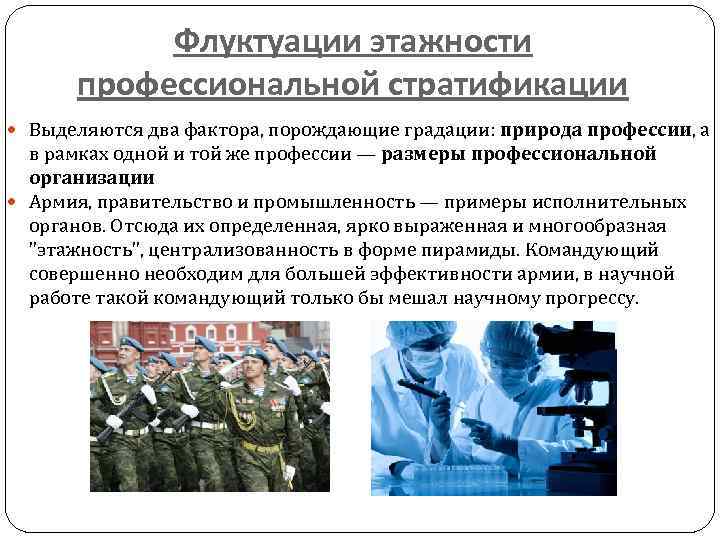 Флуктуации этажности профессиональной стратификации Выделяются два фактора, порождающие градации: природа профессии, а в рамках одной и той же профессии — размеры профессиональной организации Армия, правительство и промышленность — примеры исполнительных органов. Отсюда их определенная, ярко выраженная и многообразная "этажность", централизованность в форме пирамиды. Командующий совершенно необходим для большей эффективности армии, в научной работе такой командующий только бы мешал научному прогрессу.