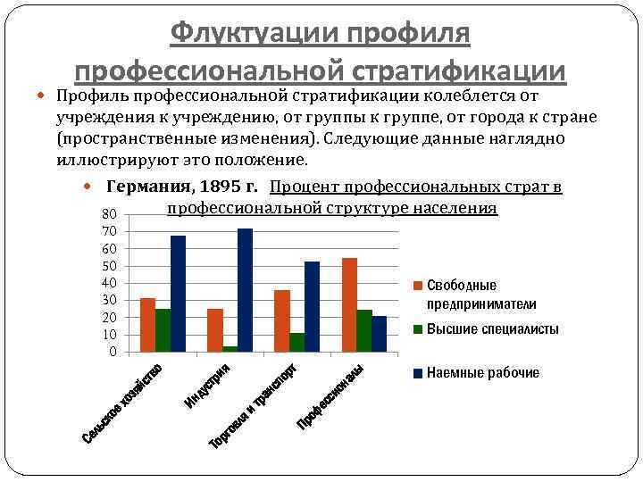 Флуктуации профиля профессиональной стратификации Профиль профессиональной стратификации колеблется от учреждения к учреждению, от группы к группе, от города к стране (пространственные изменения). Следующие данные наглядно иллюстрируют это положение. Германия, 1895 г. Процент профессиональных страт в профессиональной структуре населения 80 70 60 50 40 30 20 10 0 Свободные предприниматели лы сс фе Пр о тр ан яи вл рг о ио сп ст ду Ин То на ор я ри о тв йс зя хо ое ль ск Се т Высшие специалисты Наемные рабочие
