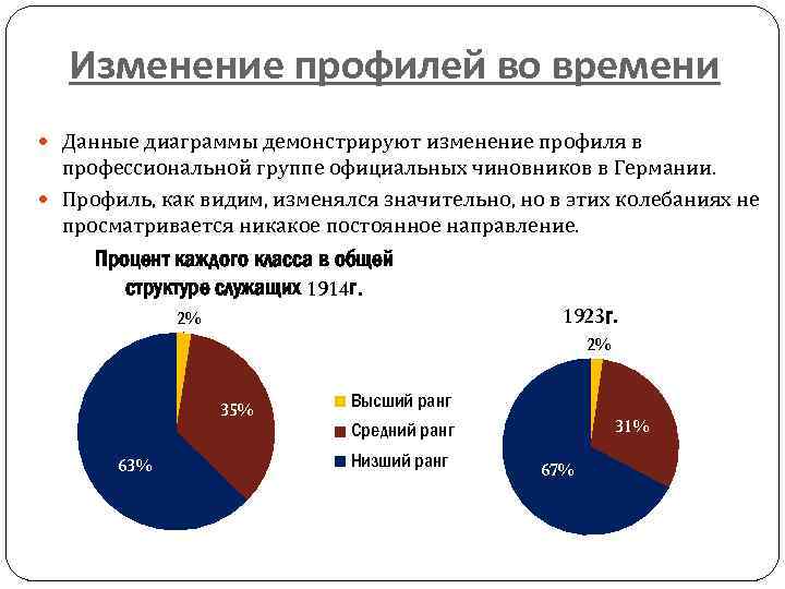 Изменение профилей во времени Данные диаграммы демонстрируют изменение профиля в профессиональной группе официальных чиновников в Германии. Профиль, как видим, изменялся значительно, но в этих колебаниях не просматривается никакое постоянное направление. Процент каждого класса в общей структуре служащих 1914 г. 1923 г. 2% 2% 35% 63% Высший ранг 31% Средний ранг Низший ранг 67%