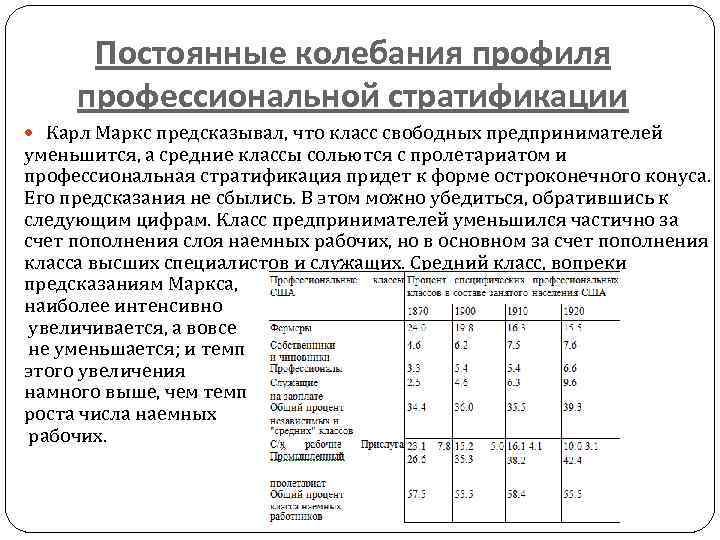 Постоянные колебания профиля профессиональной стратификации Карл Маркс предсказывал, что класс свободных предпринимателей уменьшится, а средние классы сольются с пролетариатом и профессиональная стратификация придет к форме остроконечного конуса. Его предсказания не сбылись. В этом можно убедиться, обратившись к следующим цифрам. Класс предпринимателей уменьшился частично за счет пополнения слоя наемных рабочих, но в основном за счет пополнения класса высших специалистов и служащих. Средний класс, вопреки предсказаниям Маркса, наиболее интенсивно увеличивается, а вовсе не уменьшается; и темп этого увеличения намного выше, чем темп роста числа наемных рабочих.
