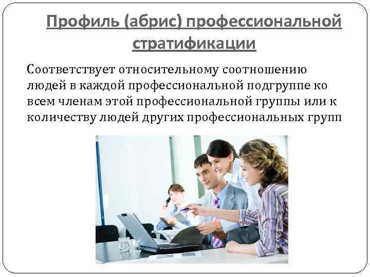 Профиль (абрис) профессиональной стратификации Соответствует относительному соотношению людей в каждой профессиональной подгруппе ко всем членам этой профессиональной группы или к количеству людей других профессиональных групп