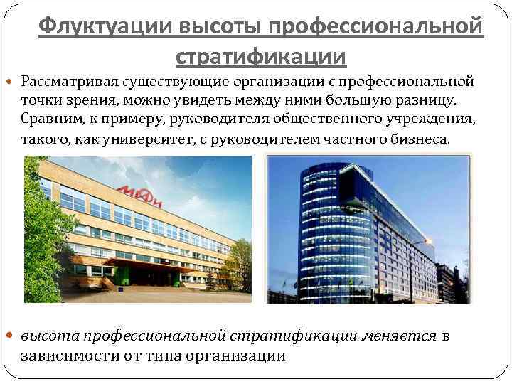 Флуктуации высоты профессиональной стратификации Рассматривая существующие организации с профессиональной точки зрения, можно увидеть между ними большую разницу. Сравним, к примеру, руководителя общественного учреждения, такого, как университет, с руководителем частного бизнеса. высота профессиональной стратификации меняется в зависимости от типа организации