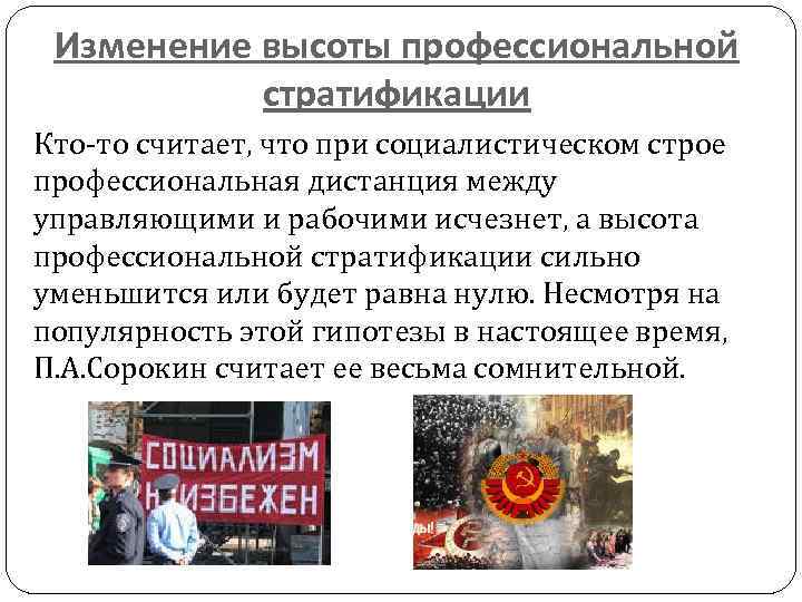 Изменение высоты профессиональной стратификации Кто то считает, что при социалистическом строе профессиональная дистанция между управляющими и рабочими исчезнет, а высота профессиональной стратификации сильно уменьшится или будет равна нулю. Несмотря на популярность этой гипотезы в настоящее время, П. А. Сорокин считает ее весьма сомнительной.