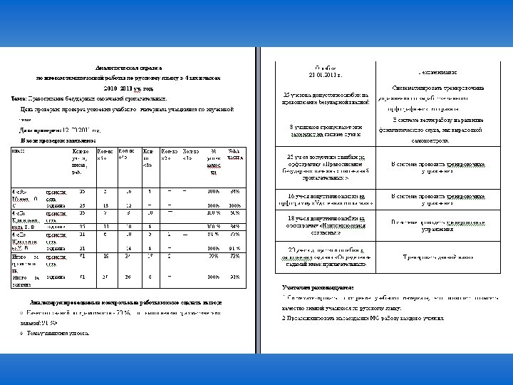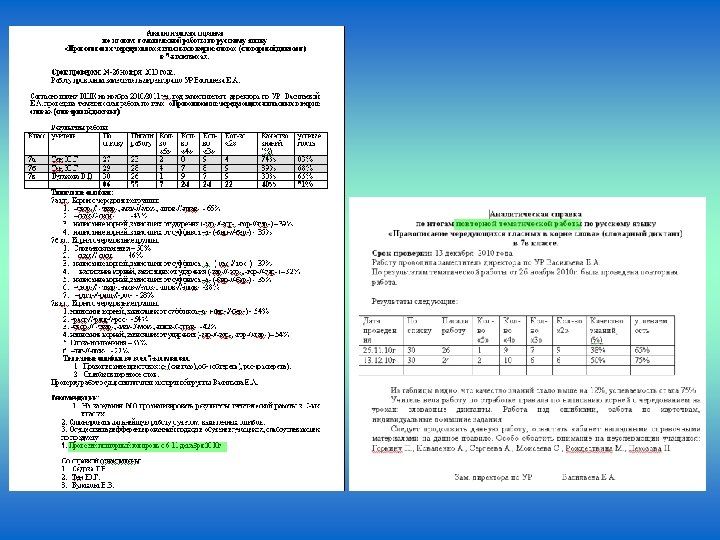 Тематические работы и контрольные срезы знаний по русскому языку ( 22 работы 5 -11 кл) 5 -ые классы по теме «Безударные окончания существительных и прилагательных» , «Правописание корней с чередованием и безударная гласная в корне» , «Синтаксический разбор предложений с однородными членами» , «Синтаксический разбор сложного предложения, знаки препинания в предложениях с прямой речью» ; 6 -ые классы - «Прямая речь» , «Правописание чередующихся гласных в корне слова» (словарный диктант), пробное тестирование по темам «Причастие и деепричастие» ; 7 -ые классы по теме «Правописание Н и НН в разных частях речи» , «Правописание НЕ с разными частями речи » , «Правописание окончаний причастий» (словарный диктант) «Выделение причастного оборота в предложении» , «Правописание чередующихся гласных в корне слова» (словарный диктант), «Н-НН в суффиксах причастий и отглагольных прилагательных» , «Запятая причастных и деепричастных оборотах» (тестовая работа), тестирование в 7 -ых классах, с целью выявления уровня подготовленности учащихся к сдаче регионального экзамена;