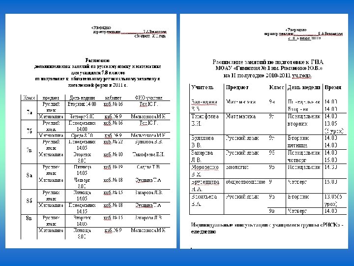 Содержание мероприятия Дата и время проведения • Проведение повторного контрольного среза знаний учащихся 9 классов. • Анализ работ. • Организация индивидуально-групповых занятий по математике и русскому языку. • Проведение родительского собрания по итогам проведенных работ. • Организация работы психологической службы гимназии: 1)выступление на родительских собраниях; 2)подготовка памятки для родителей и выпускников по подготовке к итоговой аттестации; 3) тренинги для «тревожных» учащихся 4) индивидуальные консультации с родителями, выпускниками. Октябрь • Проведение административных контрольных работ по русскому языку в форме ГИА и ЕГЭ • Проведение контрольных срезов по текстам Управления образования города по русскому языку, математике, химии, обществознанию • Анализ проведенных работ на предметных МО. • Корректировка плана индивидуальных занятий. • Определение группы РИСК на 2 полугодие. Декабрь, март, апрель Декабрь