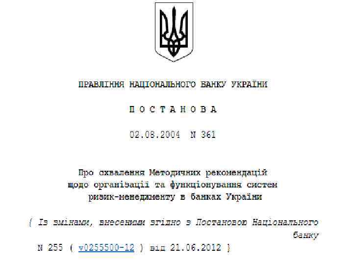 Елементи системи управління ризиками Виявлення ризику Оцінка ризику Контроль ризику Моніторинг ризику Організаційне та функціональне забезпечення ризик-менеджменту Функціональне Внутрішньобанківські Орг. структура забеспеч. Ризикнормативні банку менеджменту документи Оцінювання системи управління ризиками Персонал для Положення про Процеси управ. Системи управл. управ. ризиками банку контролю ризиками