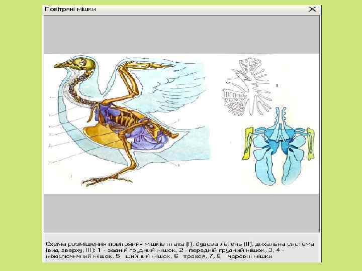 Дихальна система Орган дихання птахів — легені (щільні губчасті тіла, прикріплені до спинної стінки грудної клітки). Крім легенів до органів дихання належать трахея і бронхи. Частина бронхів розширюється в тонкостінні повітряні мішки (їх п’ять пар), що розташовуються між внутрішніми органами, м’язами під шкірою й у деяких пневматичних кістках. Вони беруть участь у циркуляції повітря через легені й оберігають організм від перегріву. У повітряних мішках газообмін не відбувається. Дихання птаха, що сидить, відбувається за рахунок зміни об’єму грудної клітки, що виникає шляхом видалення й наближення грудини за зміни кута між рухливо з’єднаними спинними й грудними частинами ребер. У польоті грудина нерухомо фіксована і дихання відбувається з допомогою повітряних мішків, що відіграють роль насоса. Під час підняття птахом крил їхній об’єм збільшується і повітря засмоктується в легені та повітряні мішки. Унаслідок опускання крил об’єм повітряних мішків зменшується і повітря виштовхується назовні. Відсутність газообміну в повітряних мішках і особливий порядок руху повітря в органах дихання птахів забезпечують надходження насиченого киснем повітря в легені як під час вдиху, так і під час видиху. Особливості будови дихальної системи птахів, пов’язані з польотом 1. Наявність повітряних мішків. 2. Подвійне дихання.