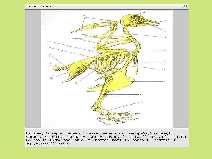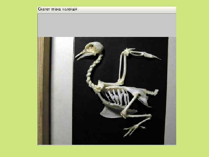 Лабораторна робота № 14 «Вивчення особливостей будови скелета птахів» Цілі: ознайомитись із особливостями будови скелета птахів, у висновках зазначити, які особливості будови скелета птахів є ознаками пристосованості до польоту. Обладнання та матеріали: скелет птаха, лупа ручна, інструктивна картка для виконання роботи, підручник.