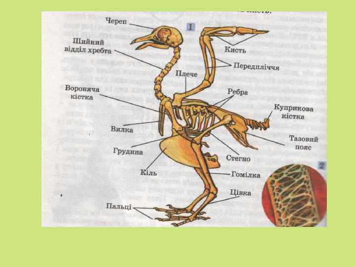 Особливості будови скелета птахів, пов’язані з польотом 1. Скелет легкий. 2. Повітряні порожнини в кістках. 3. Наявність кіля. 4. Кисть із трьома пальцями. 5. Цівка. 6. Грудний та попереково-крижовий відділ хребта зрослися