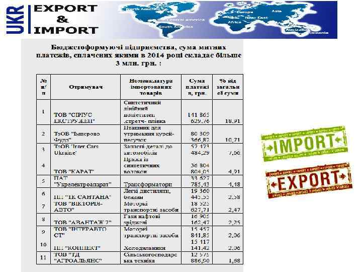 ХМЕЛЬНИЦЬКА ОБЛАСТЬ (ХМЕЛЬНИЦЬКА МИТНИЦЯ) Основні тенденції сплати митних платежів ІМПОРТ – 633 МЛН. грн. - оподаткований – 549 млн. (у 2013 році -513 млн); - сплачено з імпорту – 1 млрд. 6 млн. грн. БЮДЖЕТОФОРМУЮЧІ ТОВАРИ -Моторні транспортні засоби для перевезення вантажів – сплачено податків 56 млн. грн, митна вартість 176 млн. грн. ; - Полімери етилену – сплачено податків 53 млн. грн, митна вартість- 261 млн. грн. ; -Холодильники, морозильники – сплачено податків 48 млн. грн, митна вартість – 209 млн. грн.