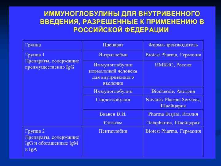 Сегодня существуют 5 типов препаратов иммуноглобулинов, каждый из которых может назначаться при различных заболеваниях и патологических состояниях: 1. Препараты специфических иммуноглобулинов, которые можно с успехом использовать при верифицированной инфекции (против герпеса 1, 2 и 6 типов, вируса Эпштейна – Барр, цитомегаловируса, микоплазм, хламидий и т. д. ). 2. Препараты нормального человеческого иммуноглобулина для внутримышечного введения (антитела разной специфичности из сывороток крови доноров), которые можно использовать для коррекции гипоиммуноглобулинемии, а также в случае инфекций, к которым отсутствуют препараты специфических иммуноглобулинов. Эффективность иммуноглобулинотерапии в последнем случае обусловлена иммуномодулирующим воздействием, наличием естественных антител в препарате, а иногда – даже и некоторого количества специфических антител от доноров, переболевших аналогичной инфекцией.